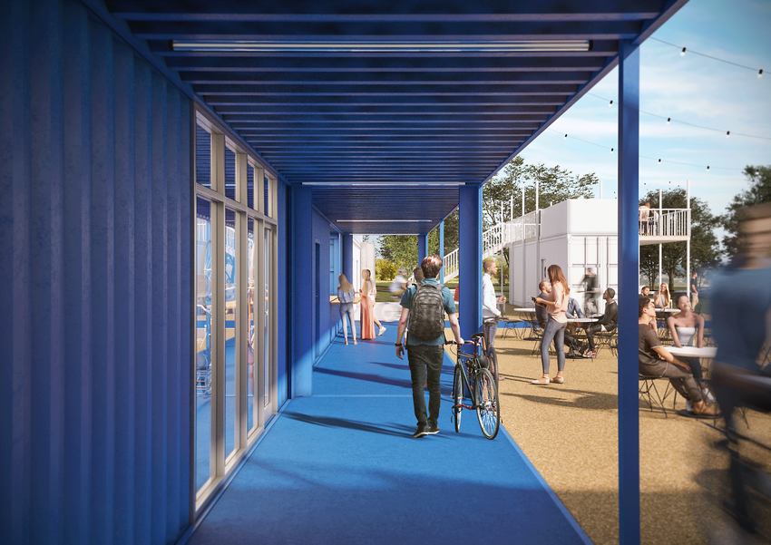 In addition to the amenities included inside the shipping containers, an elevated trail will travel across the top of them.