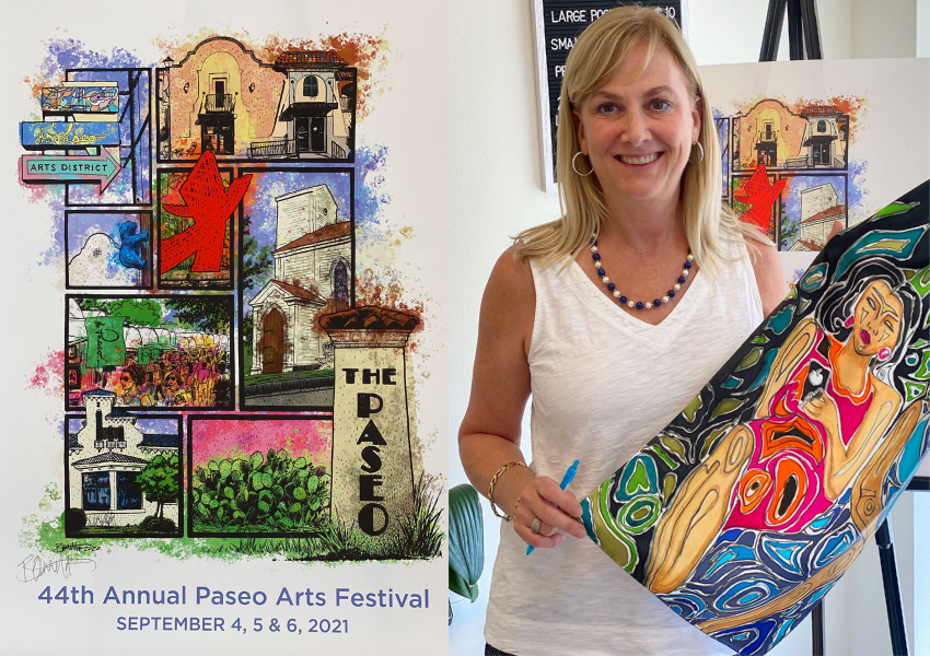 Amanda Bleakley poses with one of the hand-painted silk scarves offered for sale in the PACC gift shop.