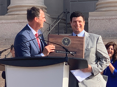 Gov. Kevin Stitt welcomes Skydweller CEO Dr. Robert Miller to Oklahoma City.