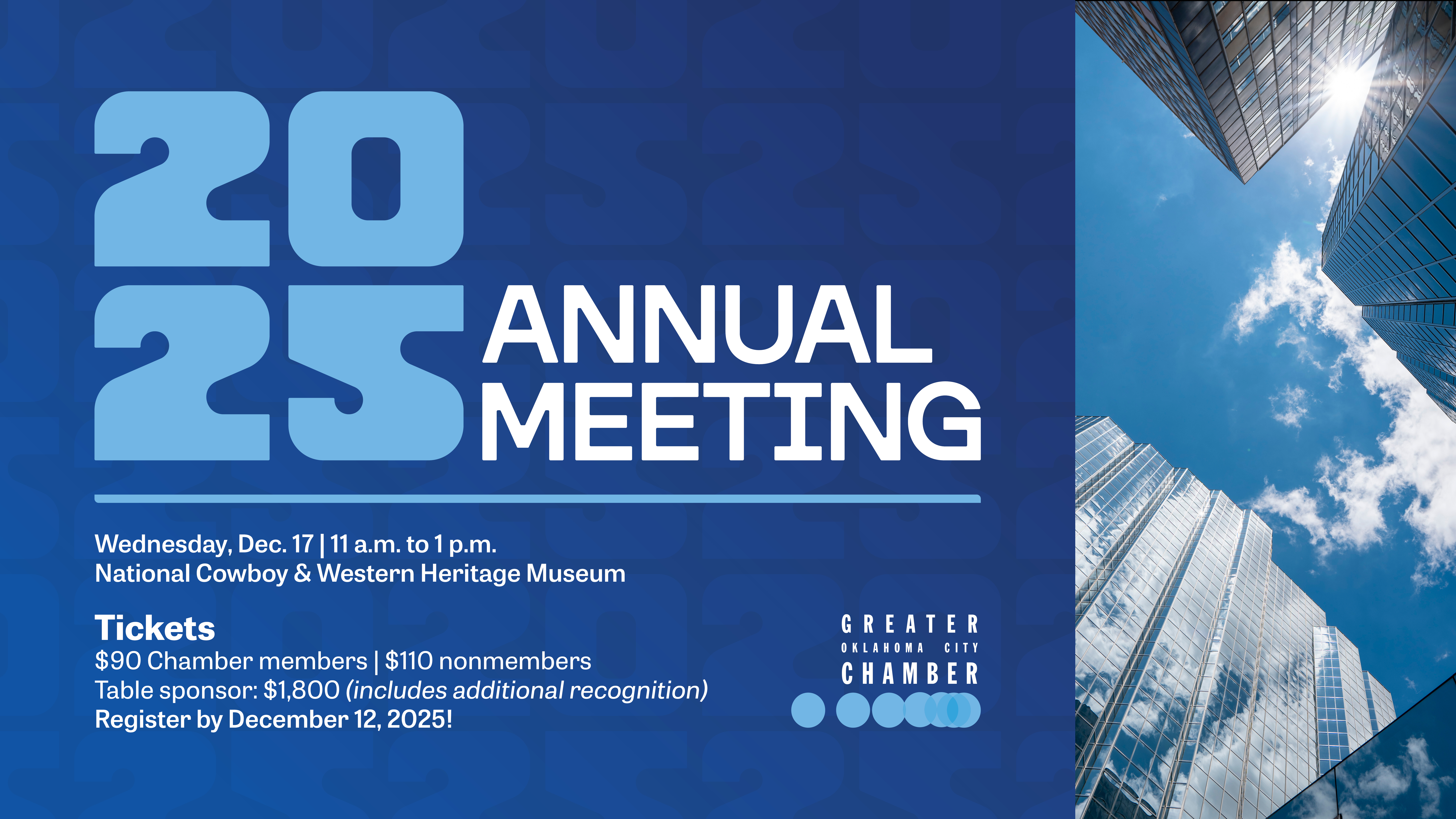 The Greater Oklahoma City Chamber will host its Annual Meeting event on Dec. 17 from 11 a.m. to 1 p.m. at the National Cowboy & Western Heritage Museum, 1700 NE 63rd St. Tickets are priced at $90 for members and $110 for non-members.