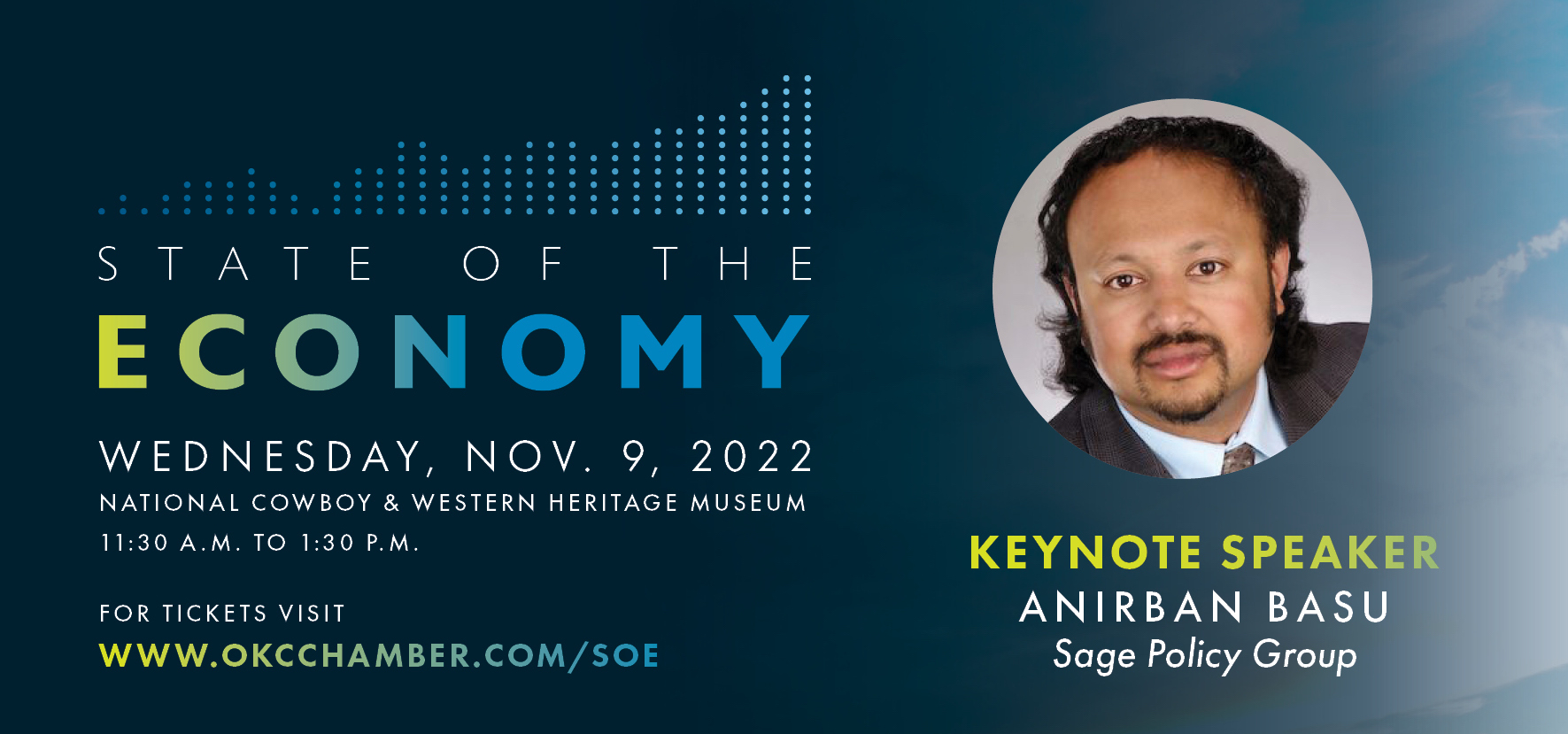 The Greater Oklahoma City Chamber welcomes expert economist Anirban Basu, chairman and CEO of Sage Policy Group, an economic and policy consulting firm in Baltimore, Md., as the featured keynote during its annual State of the Economy event, Nov. 9, from 11:30 a.m. to 1:30 p.m. at the National Cowboy & Western Heritage Museum.