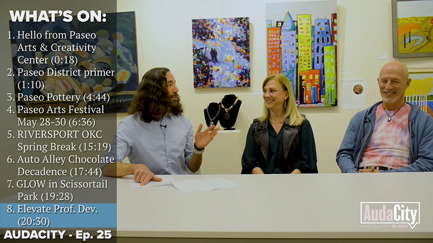 We’re at the Paseo Arts and Creativity Center speaking with Executive Director Amanda Bleakley and Paseo Pottery’s Collin Rosebrook about the Paseo District, the Paseo Arts Festival coming up Memorial Day weekend, RIVERSPORT’s Spring Break opening, Allied Arts’ temporary interactive art installations in Scissortail Park, Chocolate Decadence in Automobile Alley, OKC’s professional development conference Elevate and more.