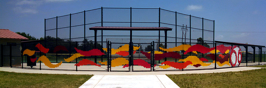 Local artist Jason Wortham recently completed the design of colored plastic pixels clipped to the outer fence of the adaptive baseball park in Route 66 Park. The project titled “It’s Outta There!” was commissioned in coordination with the Office of Arts & Cultural Affairs and the city of Oklahoma City.
