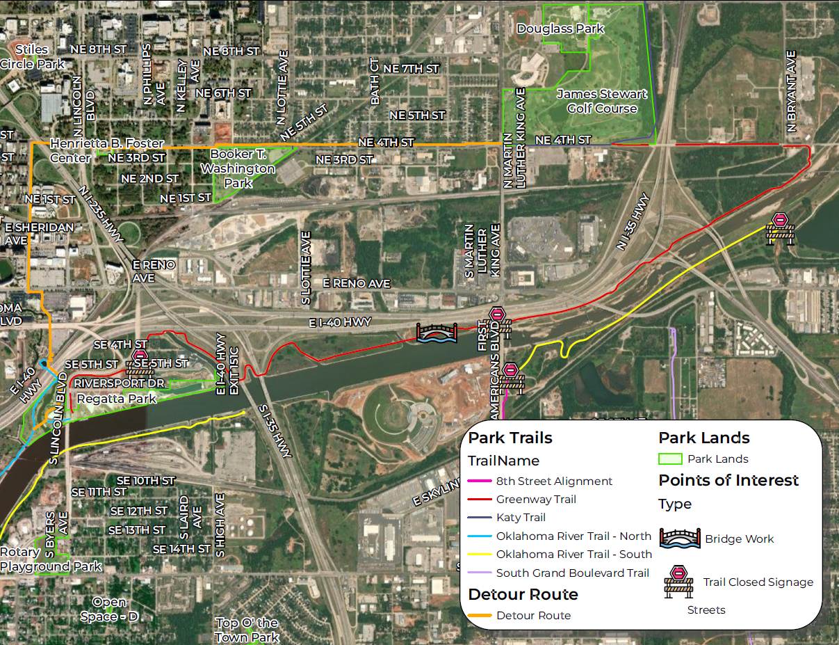 The Greenway River Trail will be closed between the Boathouse District and Eastern Avenue during the construction of the MAPS 4 bridge, expected to last about a year. To avoid dead ends, cyclists and runners can exit the Katy Trail at Douglass Park, head west on NE 4th Street to Russell M. Perry Avenue, and then proceed south into Bricktown to reconnect to the Boathouse District and the North River Trail at Regatta Park.