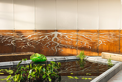 At the north end of the Conservatory’s first floor, visitors will find the Root Wall and a reflecting pool. The Root Wall depicts the beauty of plants hidden below ground on the anchoring wall that leads to the second floor. The reflecting pool at the base of the Root Wall allows visitors a moment to pause and take in the exotic water lilies. During the grand reopening weekend through the end of 2022, the Oklahoma City Museum of Art has partnered with the Myriad Gardens on a display of glass works by Dale Chihuly in the center of the reflecting pool for visitors to admire.