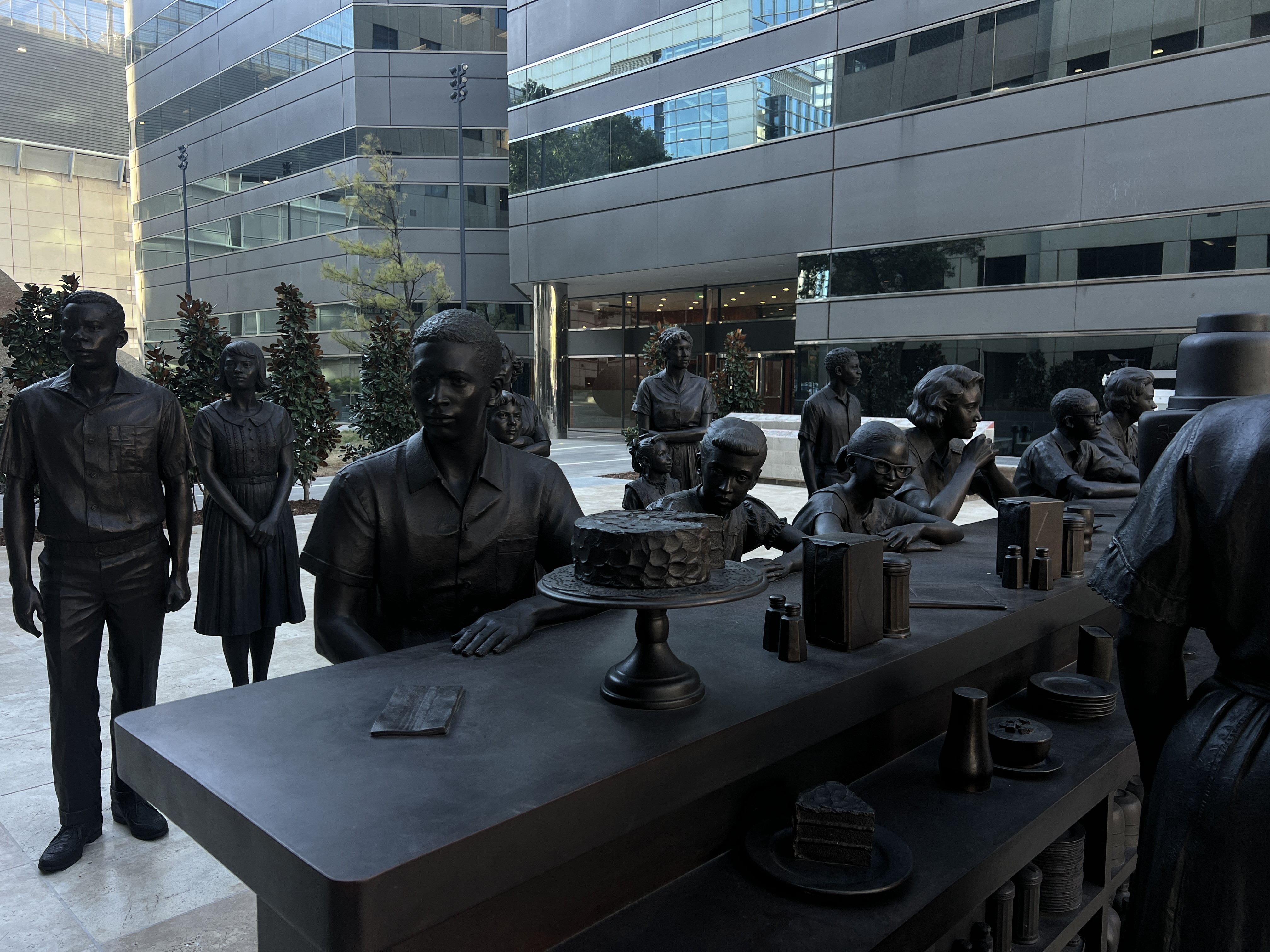 The new plaza sits near the original site of the Katz Drug Store. Its centerpiece is a four-ton bronze reproduction of the lunch counter and stools, surrounded by 15 life-sized bronze figures: Clara Luper, the 13 students, and a Katz employee. The sculpture was created by the Brooklyn-based design firm StudioEIS.