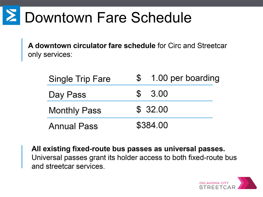 Right now, the streetcar is scheduled for 17 hours of service daily Monday through Thursday (7 a.m. to 12 a.m.), and until 2 a.m. on Friday and Saturday nights. Service will run on Sundays during special events, such as conventions, OKC Thunder games and such. There are two “loops” or streetcar routes. The main Downtown Loop, or “D Line,” is 4.86 miles long and will service all 22 stops and carry passengers through five downtown districts. The Bricktown Loop (“B Line”) is 2.04 miles long, will only service the southern portion of the route, and will run on weekends and during special events.