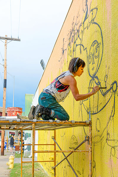 Denise Duong is a Vietnamese American artist and muralist from Oklahoma City who studied sculpture and printmaking at the School of the Art Institute of Chicago. Her work includes drawing, painting and large-scale murals, scattered throughout Oklahoma City, Tulsa and beyond. Several of her murals are on view in Oklahoma City, at 21c Museum Hotel in the Train Shed on the patio of Mary Eddy’s, and in the West Village and Plaza districts.