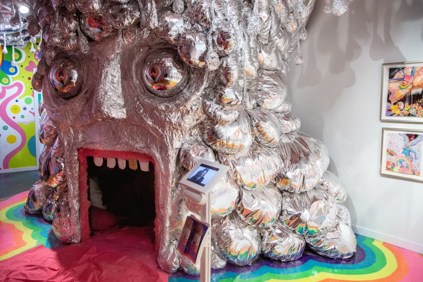 Inside the gift shop, one can find FO swag, original pieces hand-crafted by their artists, merchandise from their creative cohorts Meow Wolf and even goodies from the Flaming Lips. Just past the checkout counter and to the left lies the legendary “King’s Mouth” which is the creative offering of Wayne Coyne. This piece first showed as part of his first exhibition in 2015 at Baltimore’s American Visionary Art Museum and quickly became their most visited attraction. This globular sculpture of an other-worldly head sprouts out of the ground and seemingly has infested the entire room, if not building. With his neon pink tongue unfurled as a gooey welcome mat, the King bids you to duck into the comfy abyss beyond his gold tooth and watch the show. Inside the noggin of the King, you can recline back on his fluffy pillow palate and look up into a cylinder type structure lined with hundreds of LED lights descending down from the top. Like choreographed synapses firing away, the ensuing light show dances in unison with the Flaming Lips soundtrack that resonates throughout the space. Once enveloped in the installation, it is quite easy to get lost in the experience, never wanting it to end.
