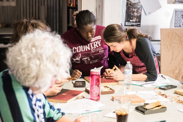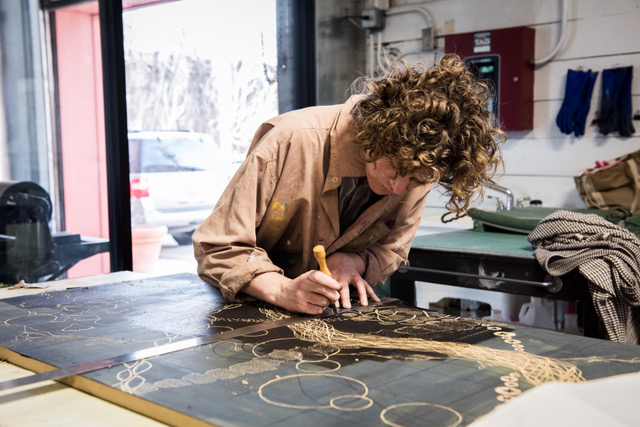 Emma Difani, here working on a woodblock, will be instructing the drypoint etching workshop.