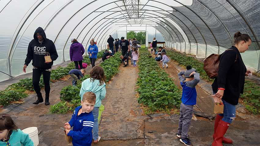 Families picking strawberries at The Farm on Fishmarket. Photo credit: The Farm on Fishmarket.