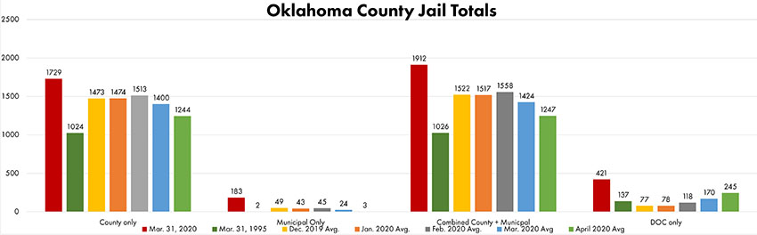 In comparison, the total jail count on March 31, 2000, was 2,333. Closer to the April 10 recent low, the total jail count on March 31, 1995 was 1,163. As the chart below points out, the jail count total would’ve been even lower if the OK Dept. of Corrections (DOC) would not have suspended their regular process of picking up those jail residents starting their full DOC sentence. The average for DOC inmates in the county jail awaiting pickup for March was 170 and for April was 245, well above the 2019 DOC yearly average of 99.