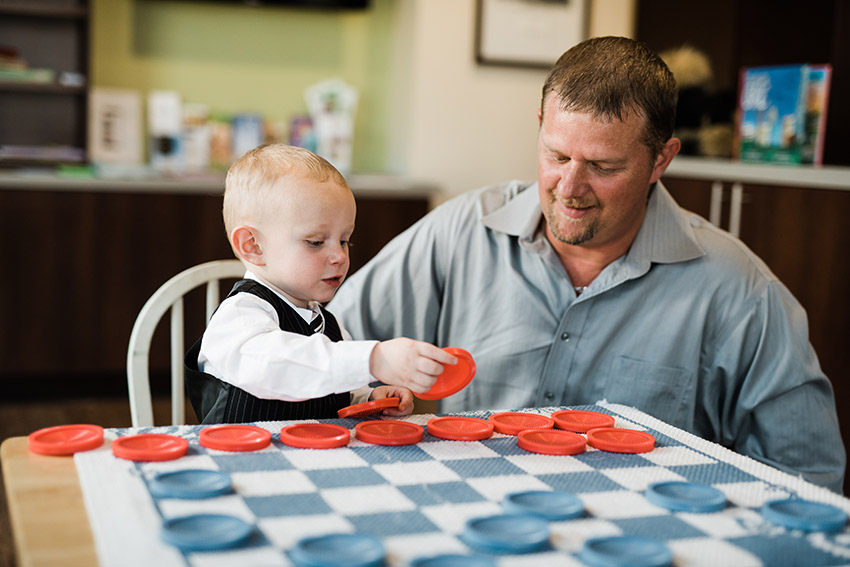 A dad and his son play with checkers pieces during a program at Sunbeam Family Services.